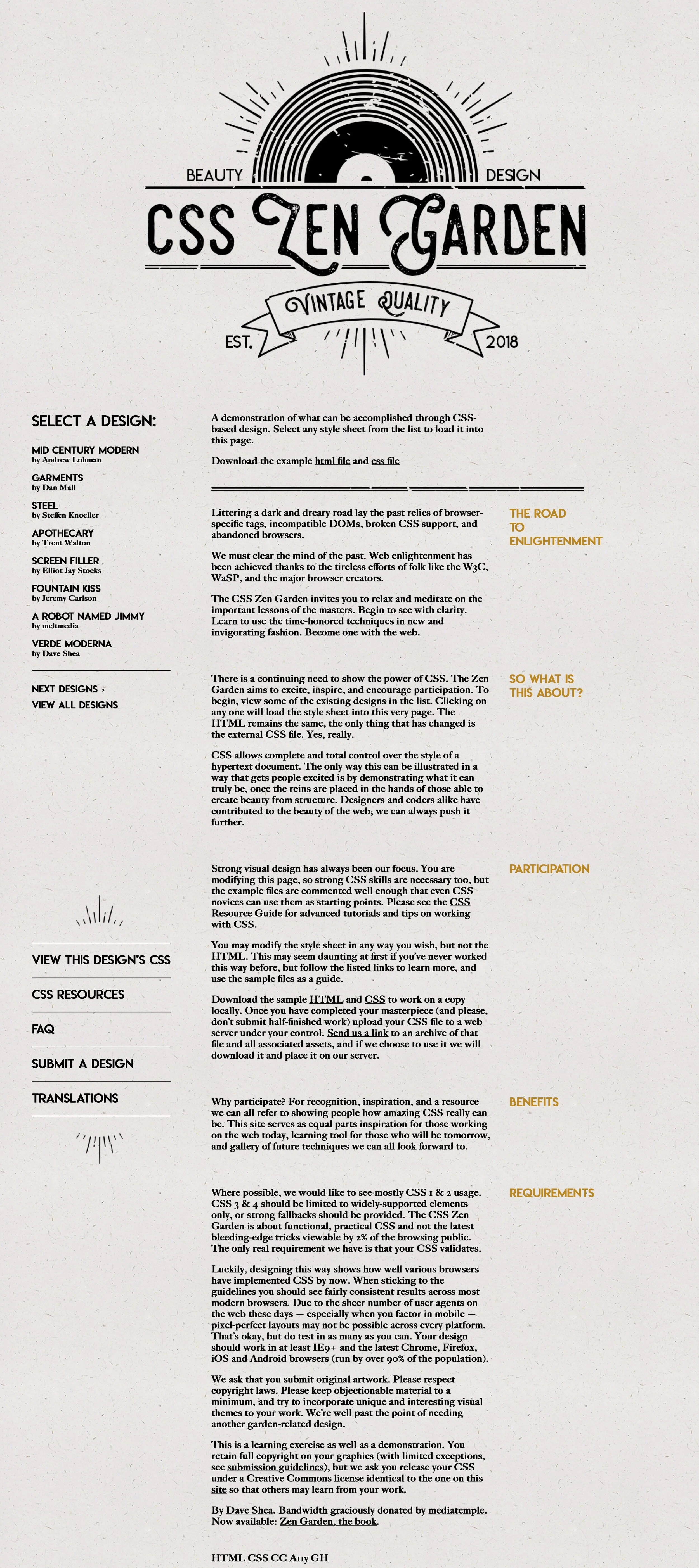 CSS Zen Garden is a project to help people practice and experiment with CSS. The website provides the HTML information and then you are free to do whatever you want with the CSS, to make your version of the Zen Garden whatever you want it to be! I decided to go with a rustic, grungy, slightly retro design, with minimal colors and a simple textured background. The header image/typography was designed in Adobe Illustrator.
